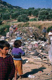 Arbeiten auf der Müllhalde Die Stadt Aydin liegt 110 Kilometer südlich von Izmir. Die meisten Touristen biegen kurz vor der Stadt in Richtung Kusadasi ab. Das Touristenparadies an der Ägäisküste ist nur 50 Kilometer entfernt. Die Müllkippe von Aydin liegt hoch über der Stadt, steile Serpentinen führen hinauf. Der Weg führt an einer Großbaustelle vorbei, die neue Universität. Kurz dahinter liegt die Abfallhalde, durch einen Zaun von den umliegenden Olivenhainen getrennt. Hier leben und arbeiten elf Familien mit 60 Personen. Zehn bis 14 Stunden pro Tag schuften sie Sommer wie Winter. Auch ihr täglicher Lohn beträgt 2,5 Millionen TL. Manche sind hier seit zwei Jahren, andere kamen erst vor wenigen Monaten. Sie stammen aus der Umgebung von Mardin und Urfa - aus dem kurdischen Südosten der Türkei. Nur einige verstehen und sprechen Türkisch. Sorgfältig trennen sie den Müll nach Plastikflaschen, Plastiktüten, sonstige Plastikabfälle, Metall, Glas und organischen Abfall. Ein Stapel mit Knochen, einer mit Brot, einer mit Gemüse - nach Prüfung wandert davon einiges in die lagereigene Küche. Gearbeitet wird mit bloßen Händen. Nur die Glassortierer tragen Handschuhe. Die Gesichter der Männer sind schwarz vom Dreck, die der Frauen mit Tüchern verhüllt. Die Kinder suchen sich Spielzeug im Abfall: eine Puppe ohne Bein, ein kaputter Ball, Glaskugeln. Dazwischen liegen ein Schlauch mit getrocknetem Blut und blutverschmierte Mullbinden - Krankenhausabfall. Sie hätten den Chef der Müllkippe gefragt, ob sie ihre Zelte nicht in den Olivenhainen aufstellen könnten, erzählt ein Arbeiter. Es sei ungesund auf der staubigen Müllkippe zu wohnen, ohne Schatten und frische Luft. Doch ein Umzug wurde verweigert, ohne Begründung. Strom gibt es manchmal für zwei Stunden am Tag. Wasser wird in einem Container geliefert. Niemand weiß, woher es kommt. Damit wird gekocht, gewaschen, geputzt. Der Chef, das haben sie beobachtet, trinkt nicht von dem Wasser. Neben dem Container befindet sich der Waschplatz für 60 Personen, abgetrennt mit vier Vorhängen, die man im Müll gefunden hat. Der Chef des Mülls kommt aus Sivas. Er lebt seit 18 Jahren vom Abfall, hat selber bis vor drei Jahren Müll getrennt. Jetzt, mit den billigen Arbeitskräften aus dem Osten, geht es ihm besser. Für seinen Betrieb zahlt er eine Gebühr an die Verwaltung von Aydin. Den sortierten Müll verkauft er nach Izmir. Dort wird das Plastik gepreßt, verladen und geht dann per Schiff nach China, sagt er. So werde es überall in der Gegend gemacht. Das Müllgeschäft in der touristenreichen Ägäisregion blüht. |